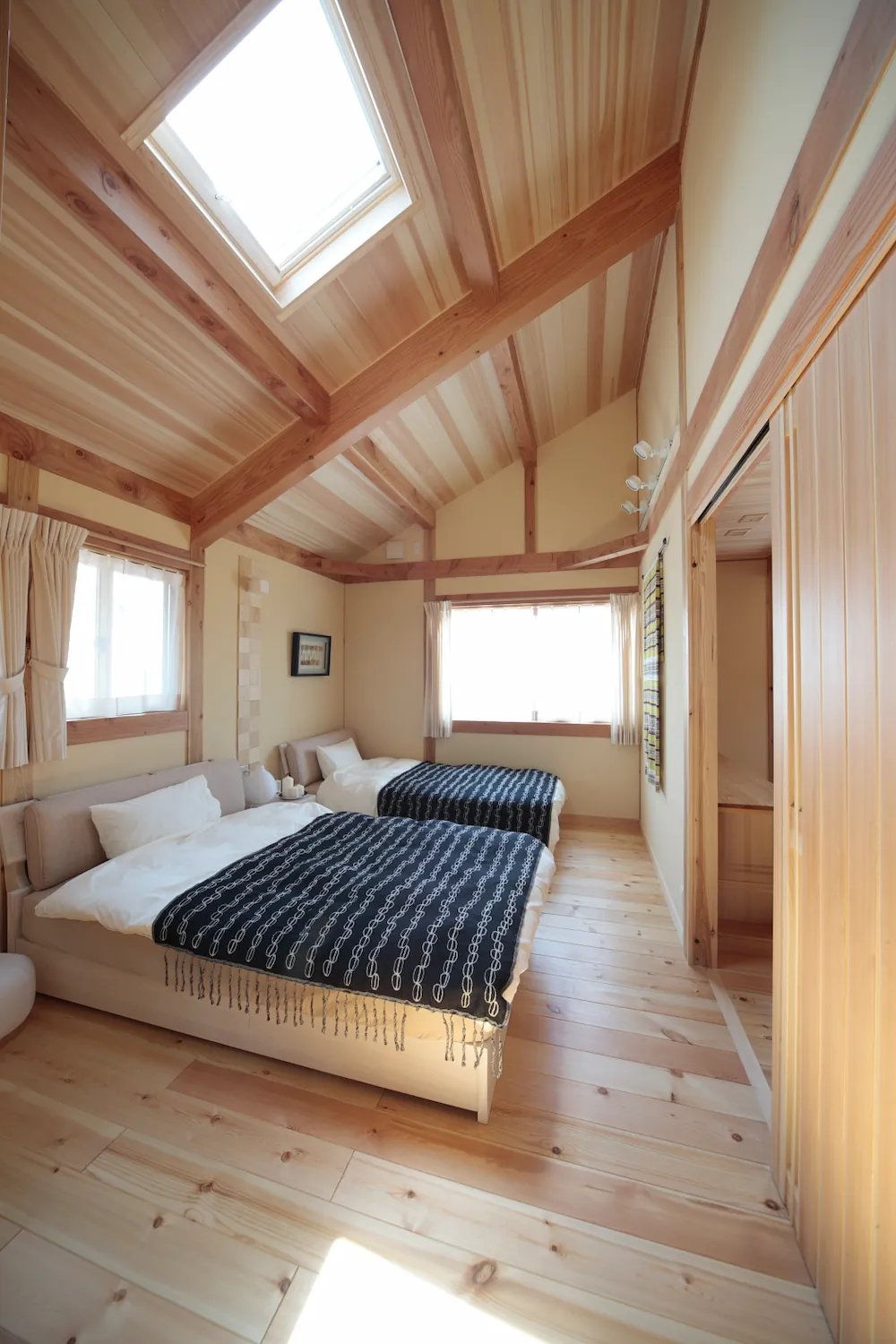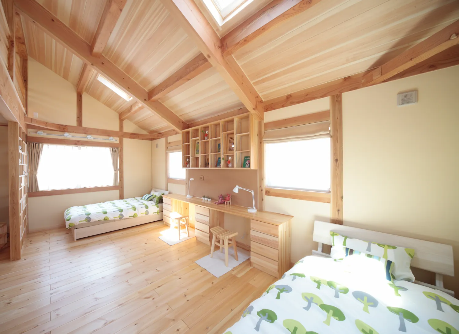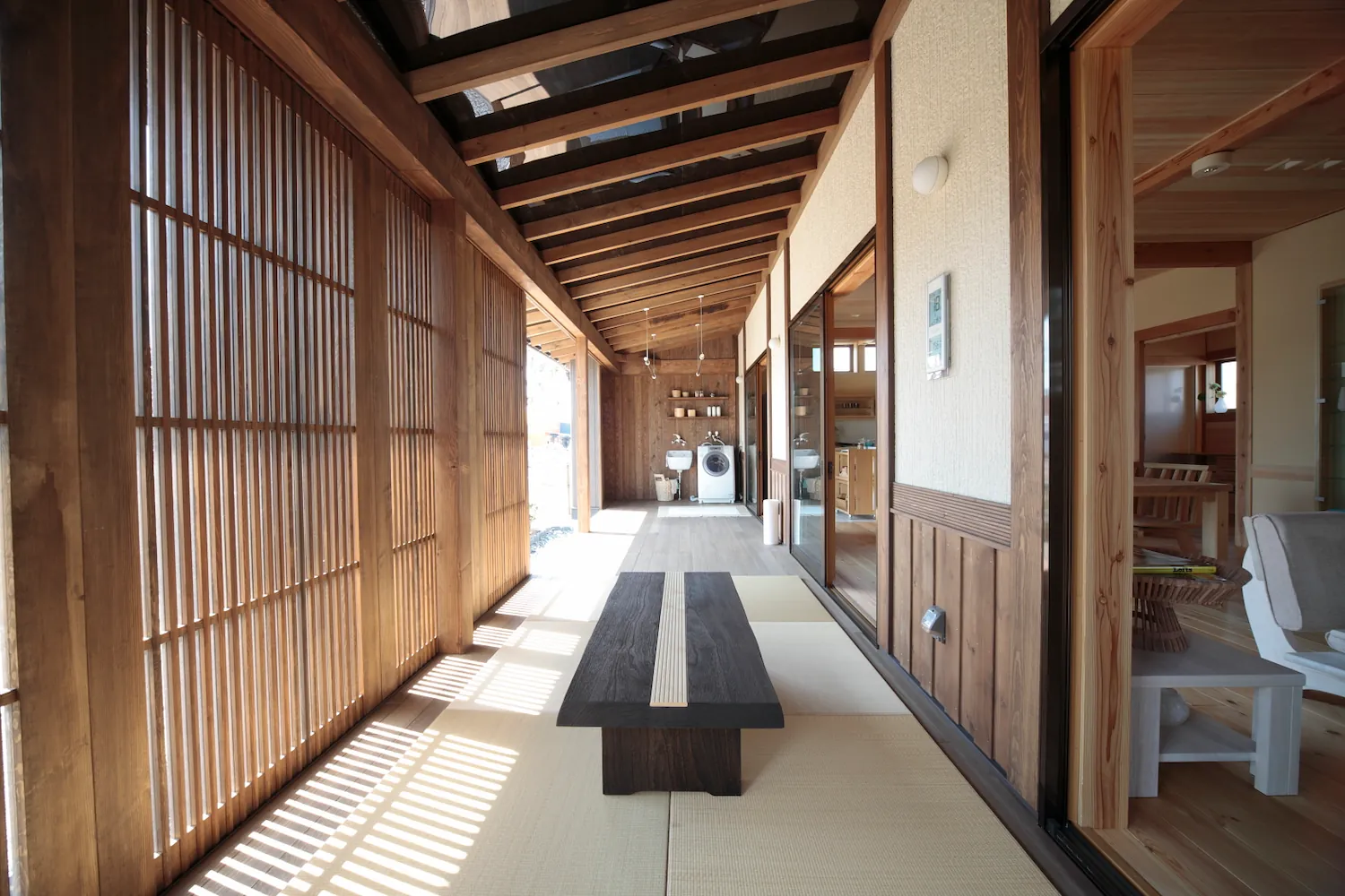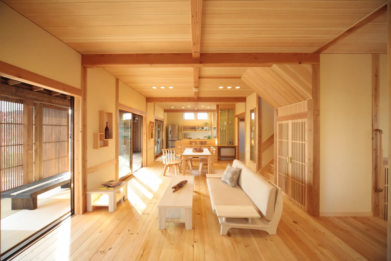 格子や軒、木組みといった和の意匠を大切にしながら、現代の暮らしに合わせて設計された住まい。 やわらかく差し込む光と無垢材の質感が空間全体を包み込み、落ち着きと心地よさを生み出します。 開放感のあるLDKと、ほどよく区切られた各空間が、家族それぞれの時間も大切にできる設計です。