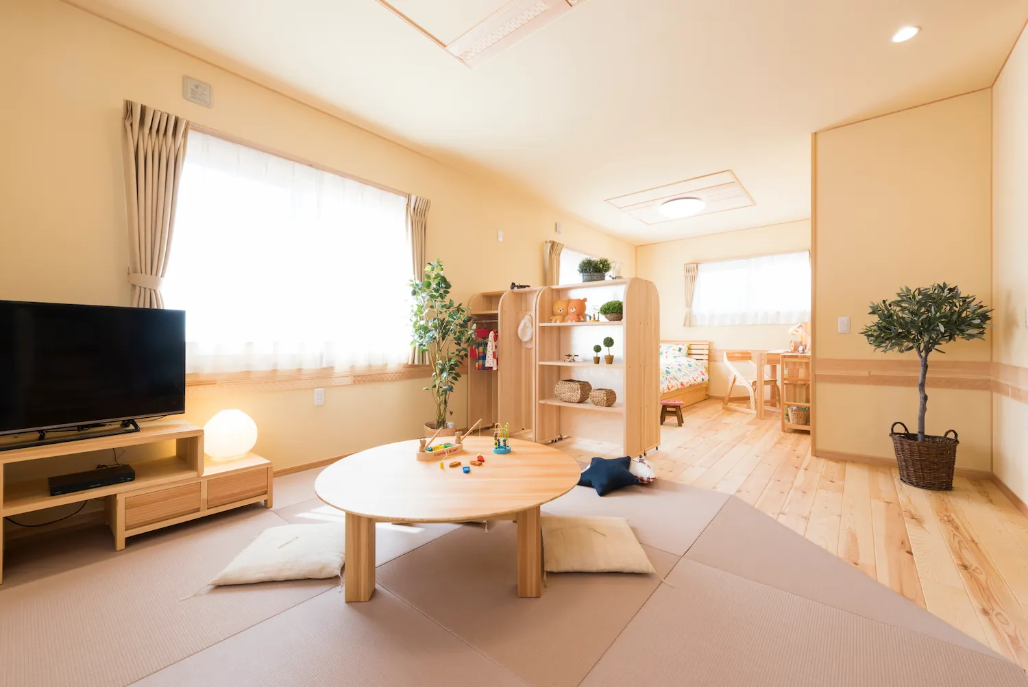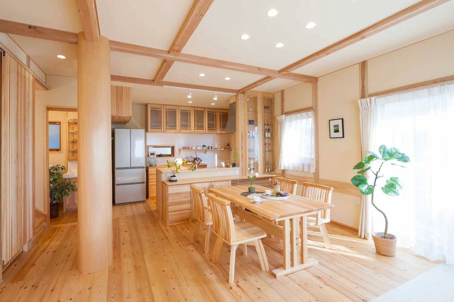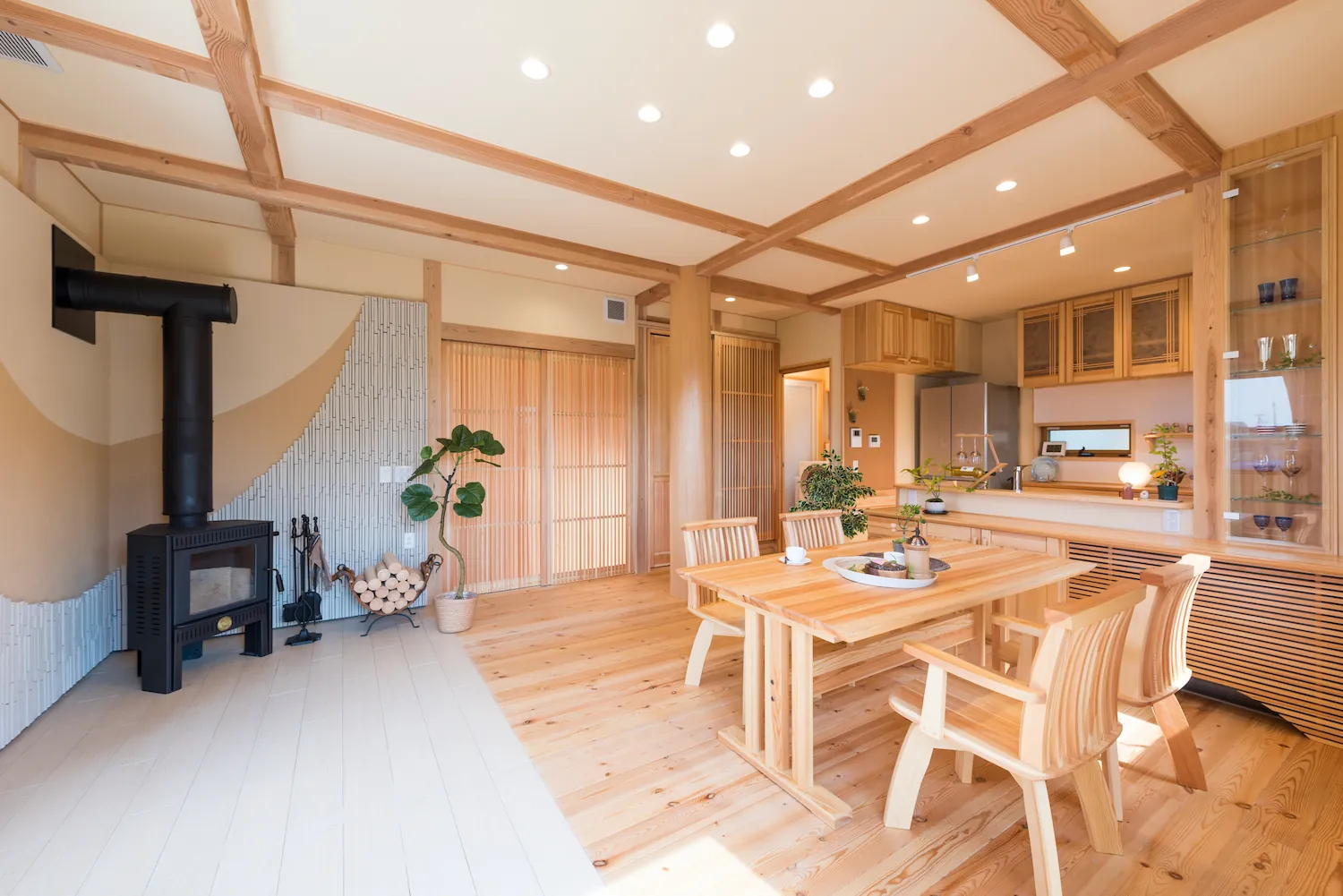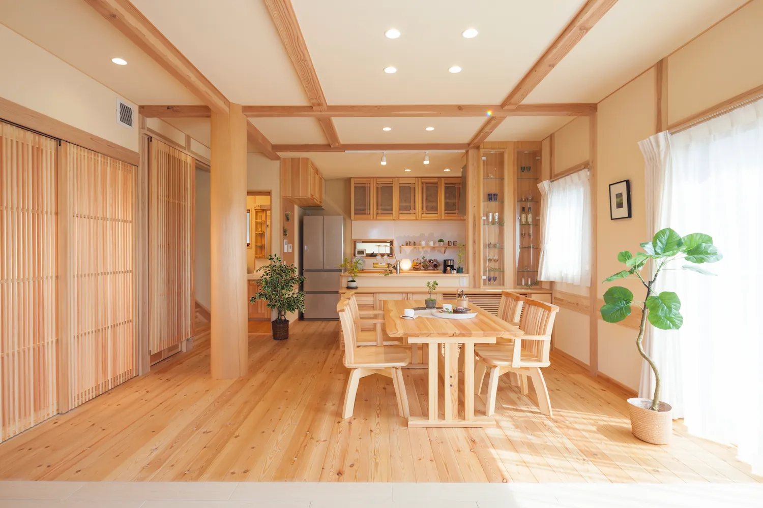 木の温もりとやわらかな光に包まれた、心地よさを大切にした住まい。 無垢材をふんだんに使った空間は、見た目の美しさだけでなく、日々の暮らしの中で安心感と落ち着きを与えてくれます。 家族が自然と集まり、ゆったりとした時間を過ごせるように設計された住まいです。