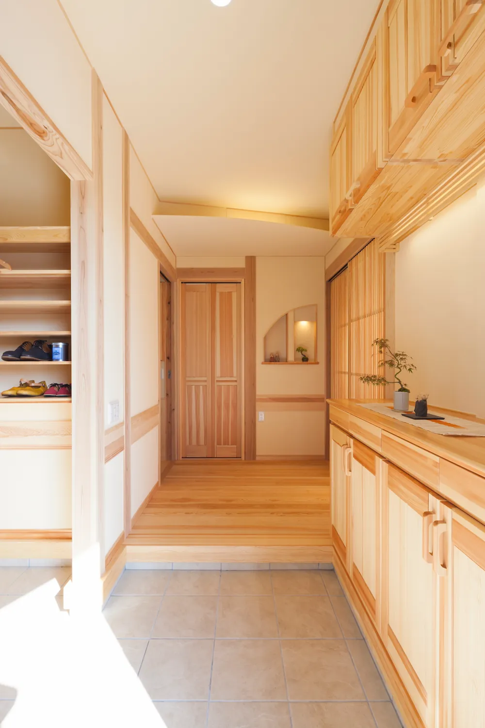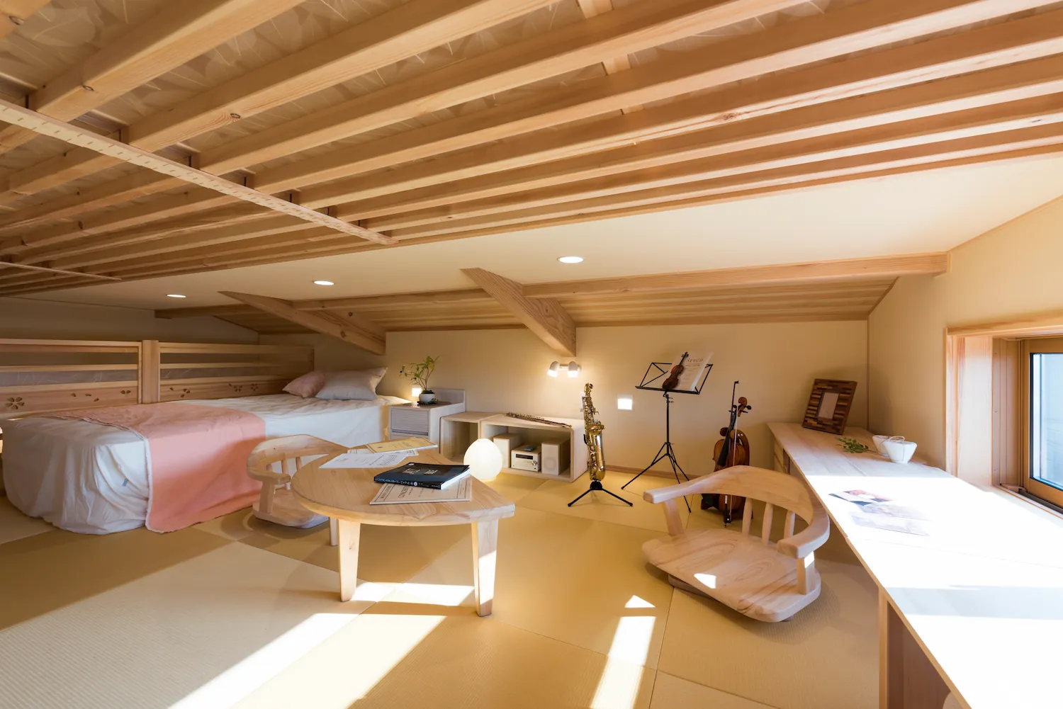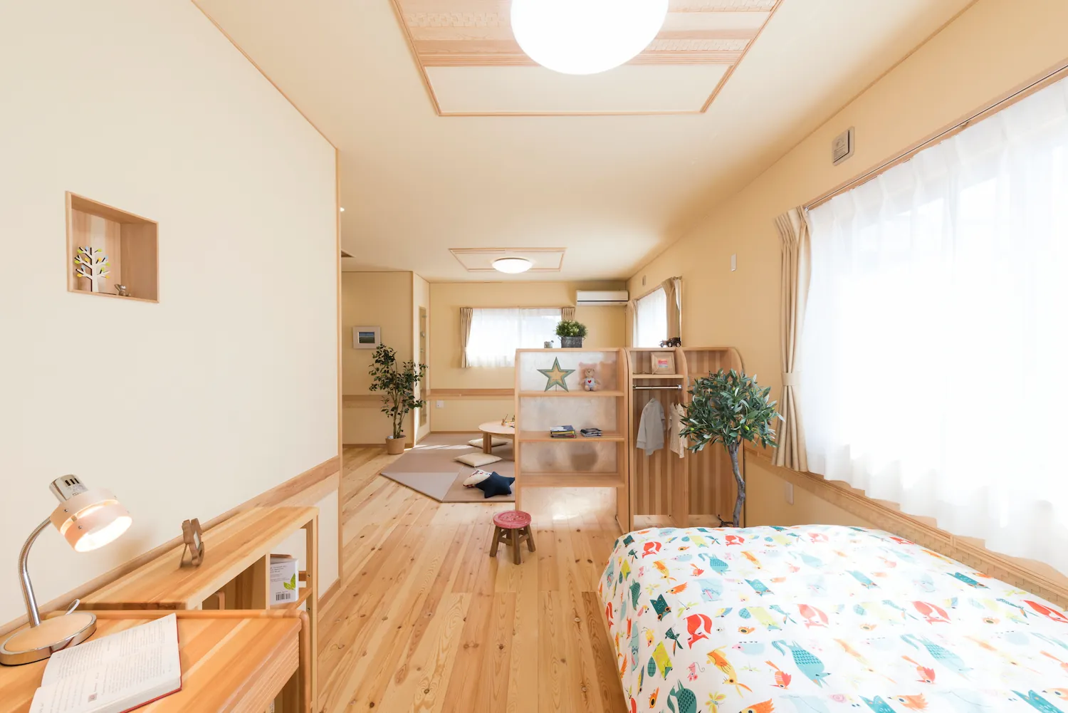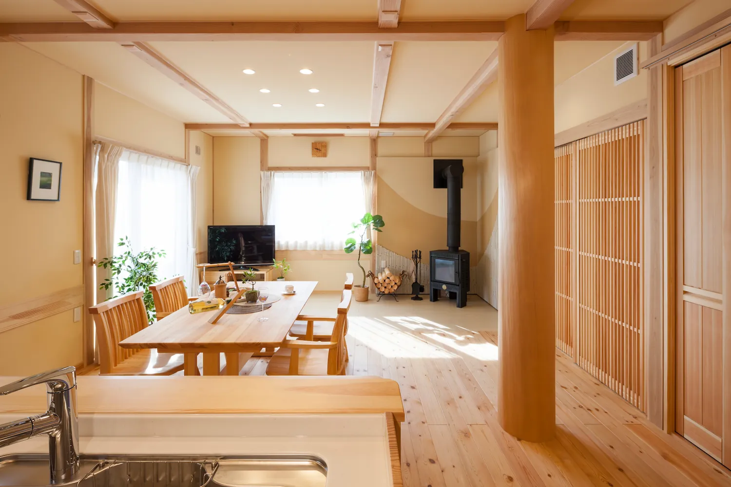 木の温もりとやわらかな光に包まれた、心地よさを大切にした住まい。 無垢材をふんだんに使った空間は、見た目の美しさだけでなく、日々の暮らしの中で安心感と落ち着きを与えてくれます。 家族が自然と集まり、ゆったりとした時間を過ごせるように設計された住まいです。