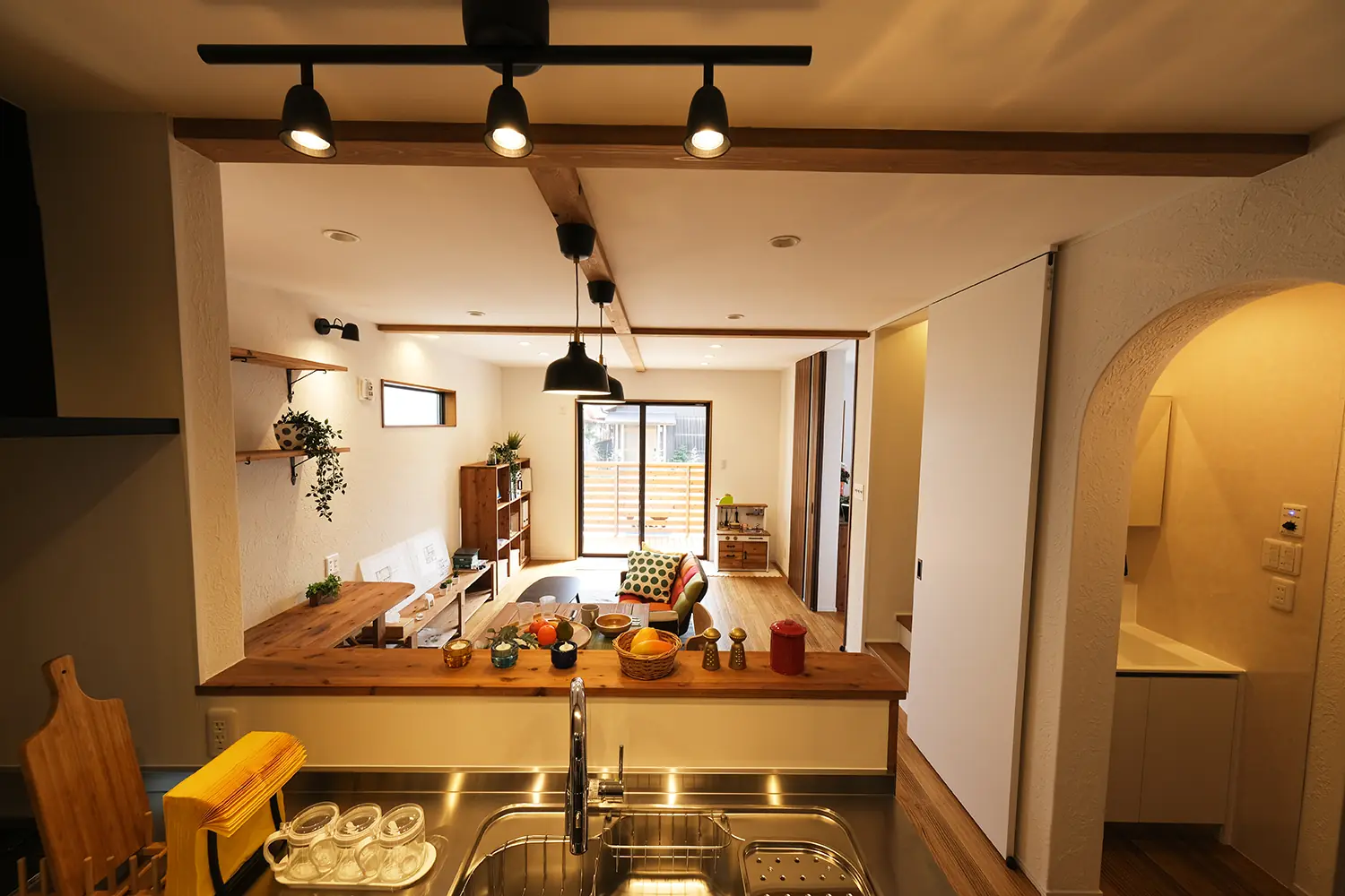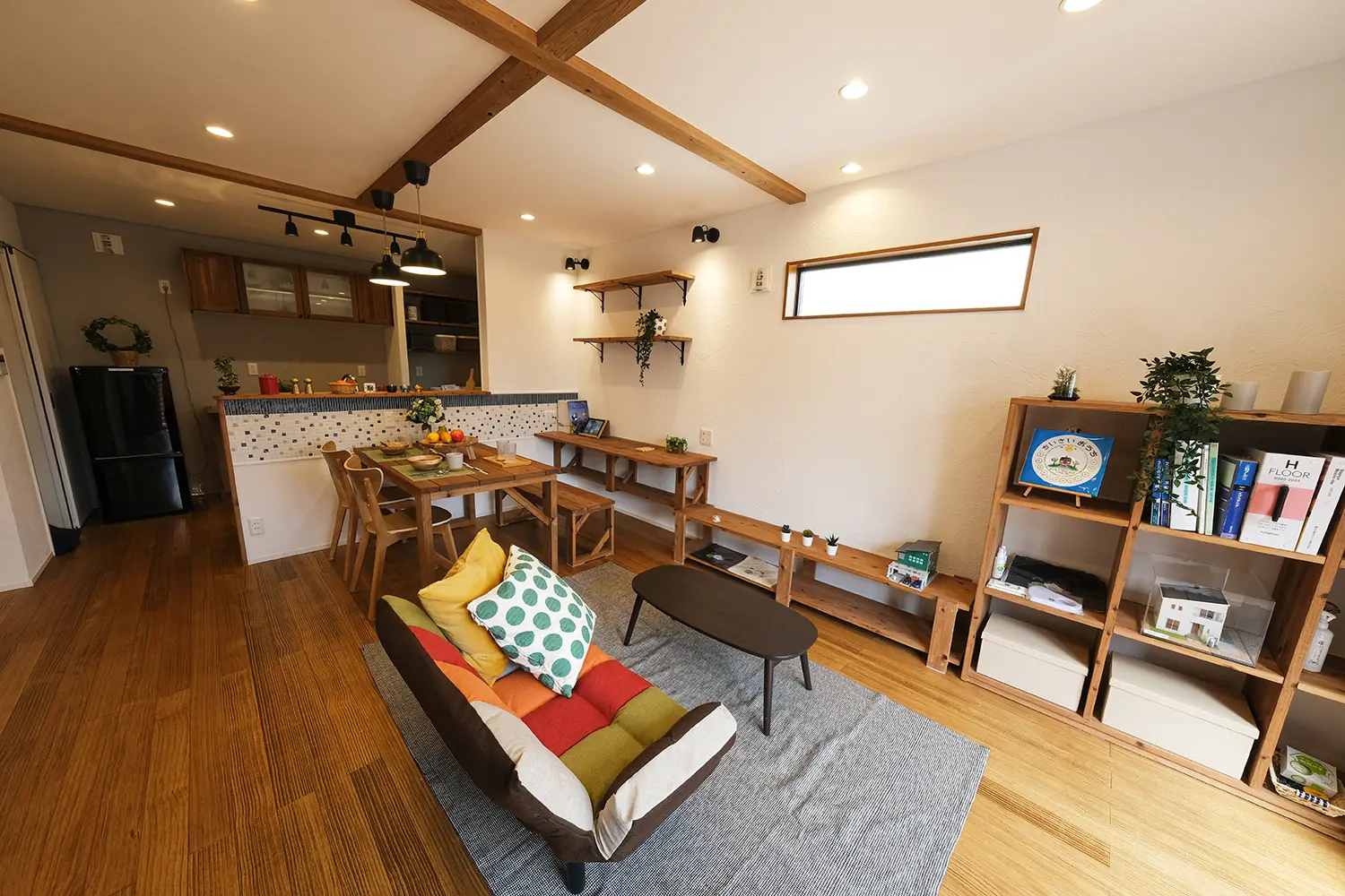 無垢の床材や化粧梁など、木の質感を活かしたナチュラルテイストの住まい。対面キッチンからリビング・ダイニングまでを見渡せる開放的なLDKは、家族の気配をいつも感じられる設計になっています。