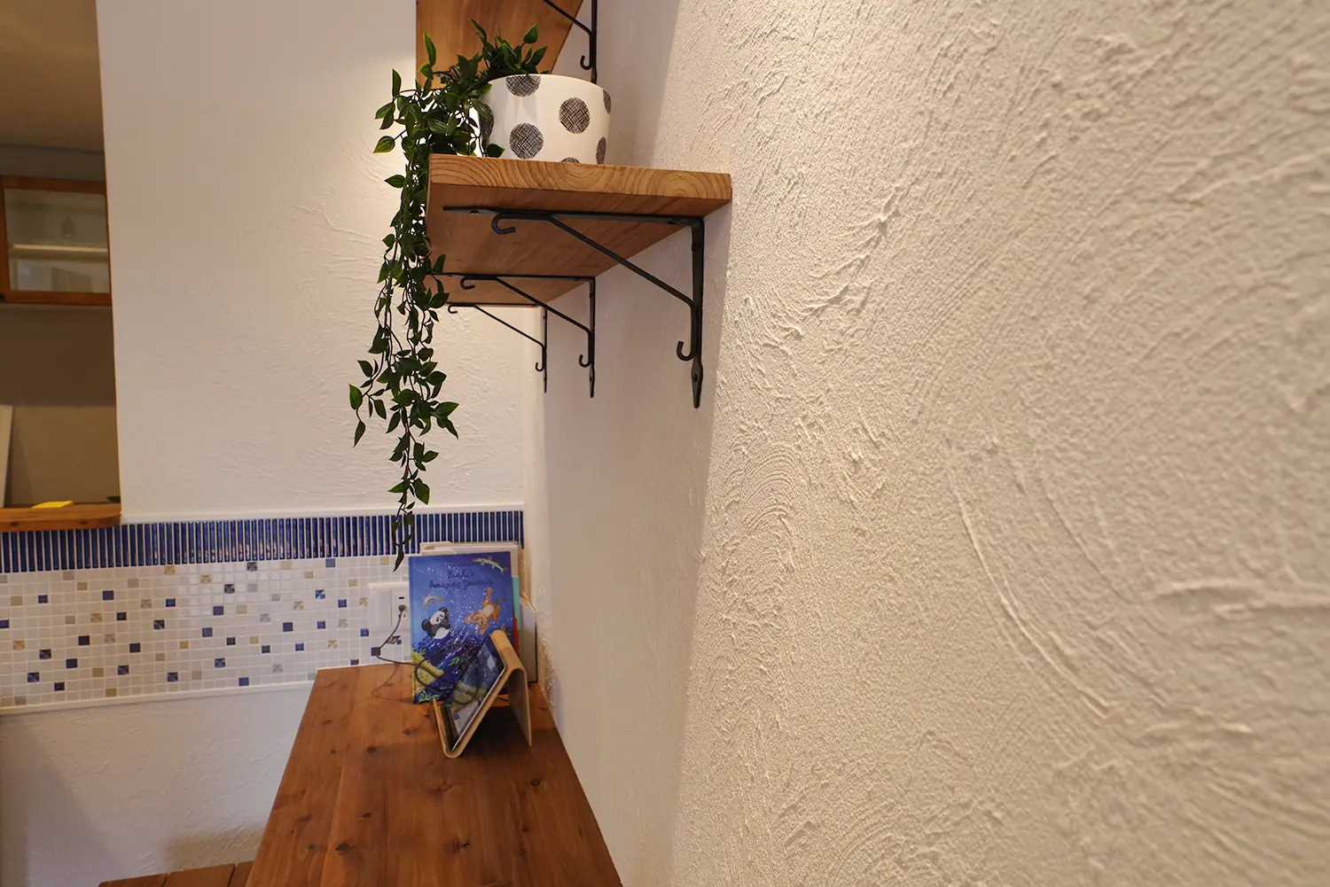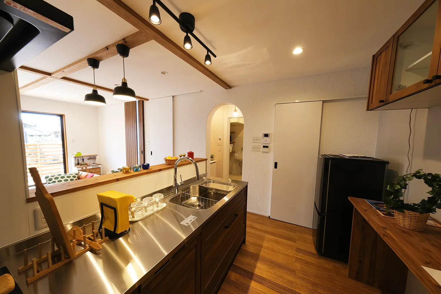 ステンレスシンクと木製カウンターを組み合わせたキッチンや、アイアン金物を使った造作棚、塗り壁のやわらかな質感など、素材一つひとつにこだわりが感じられます。収納スペースも随所に設けられており、玄関収納やオープンクローゼット、ランドリースペースの可動棚など、暮らしやすさにも配慮されています。